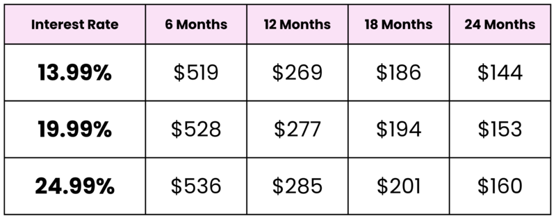 This table shows estimated monthly payments